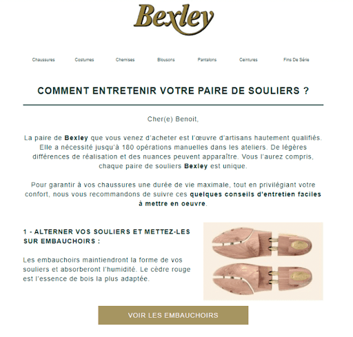 3 jours après, voici ce que je reçois dans ma boite mail :  “Comment entretenir votre paire de soulier ?”